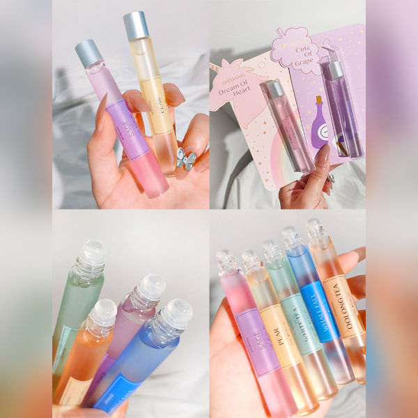 - The bottles are slender and transparent, allowing the colored liquid inside to be seen, with a rollerball applicator at the top.