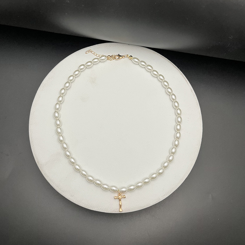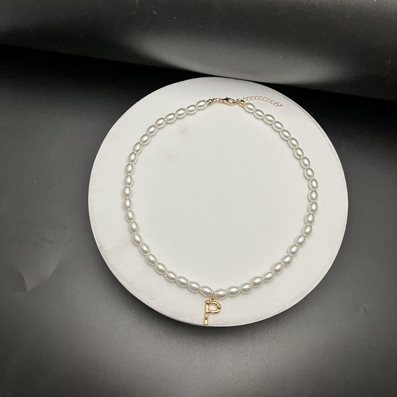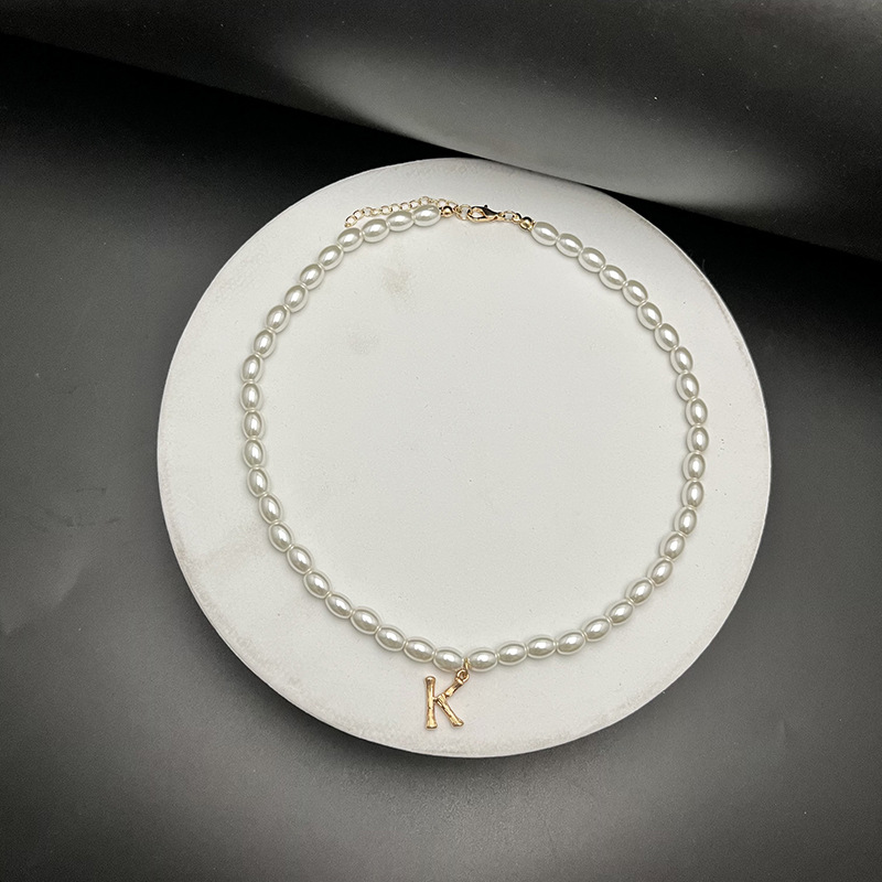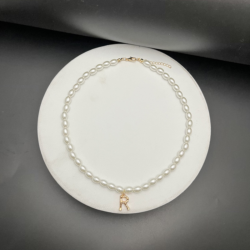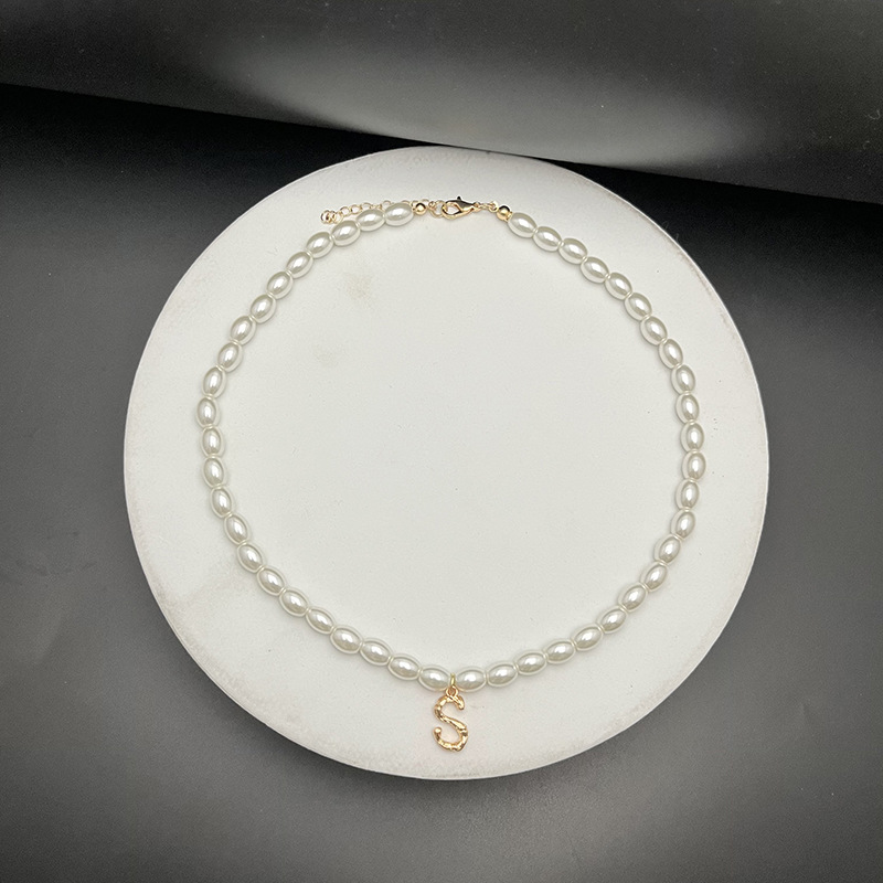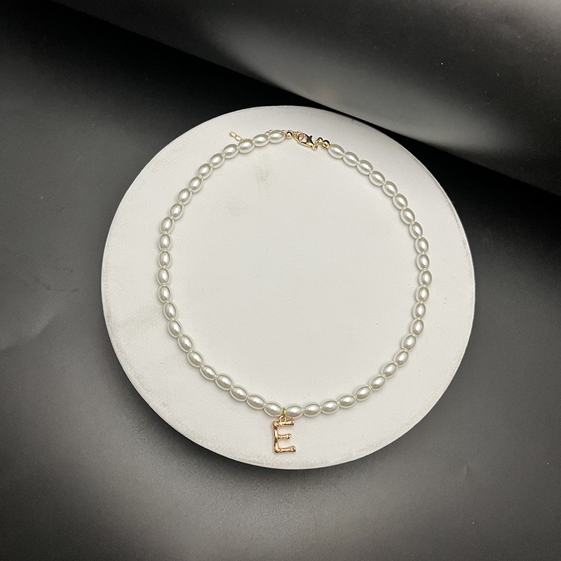 - Material: The necklaces appear to be made with white, oval-shaped pearls and golden letter pendants.