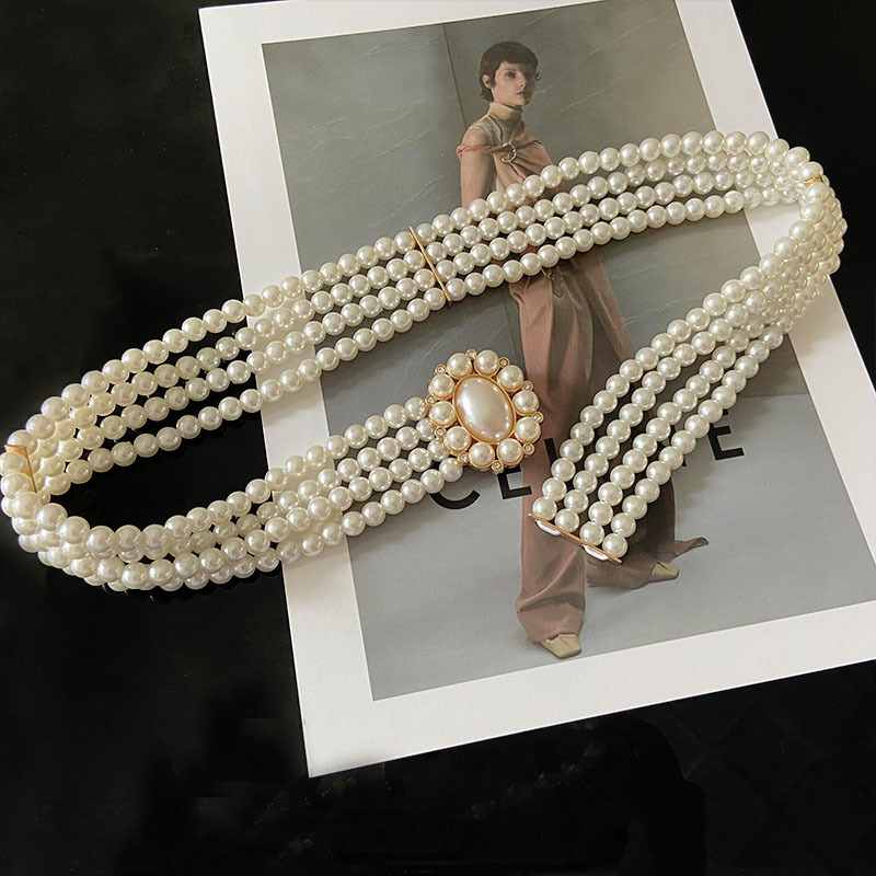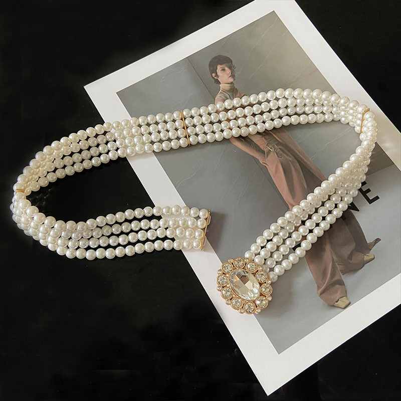 A chic pearl waist belt with a vintage-inspired crystal buckle. Perfect for dresses, gowns, or formal outfits, adding a touch of sophistication and charm.