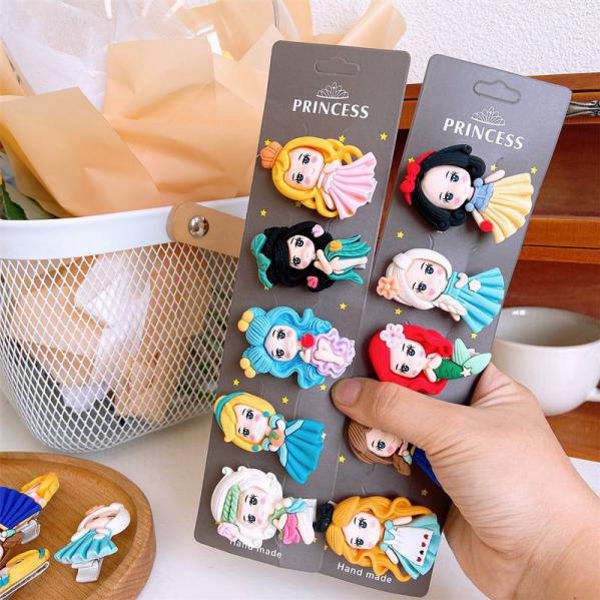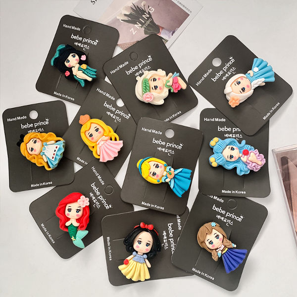 - Each accessory features a different cartoon or fairytale character, such as Snow White, Ariel (The Little Mermaid), and other princess-like figures.