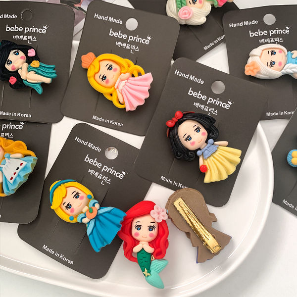 - The image displays various "bebe prince" brand hair accessories, specifically character-themed hair clips or barrettes, likely intended for children.