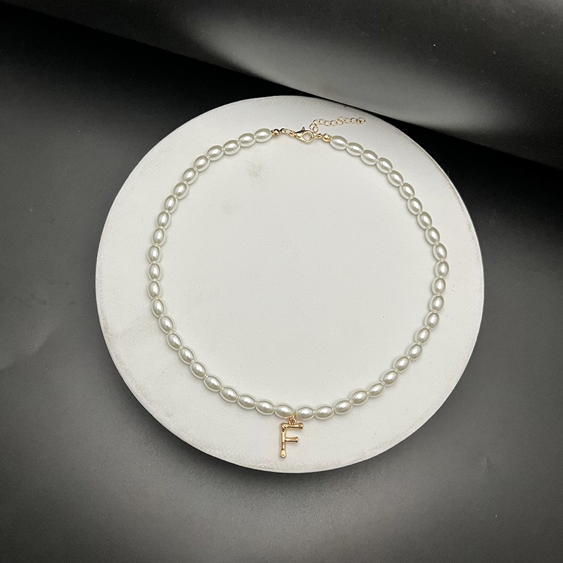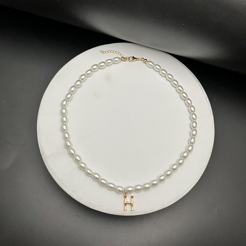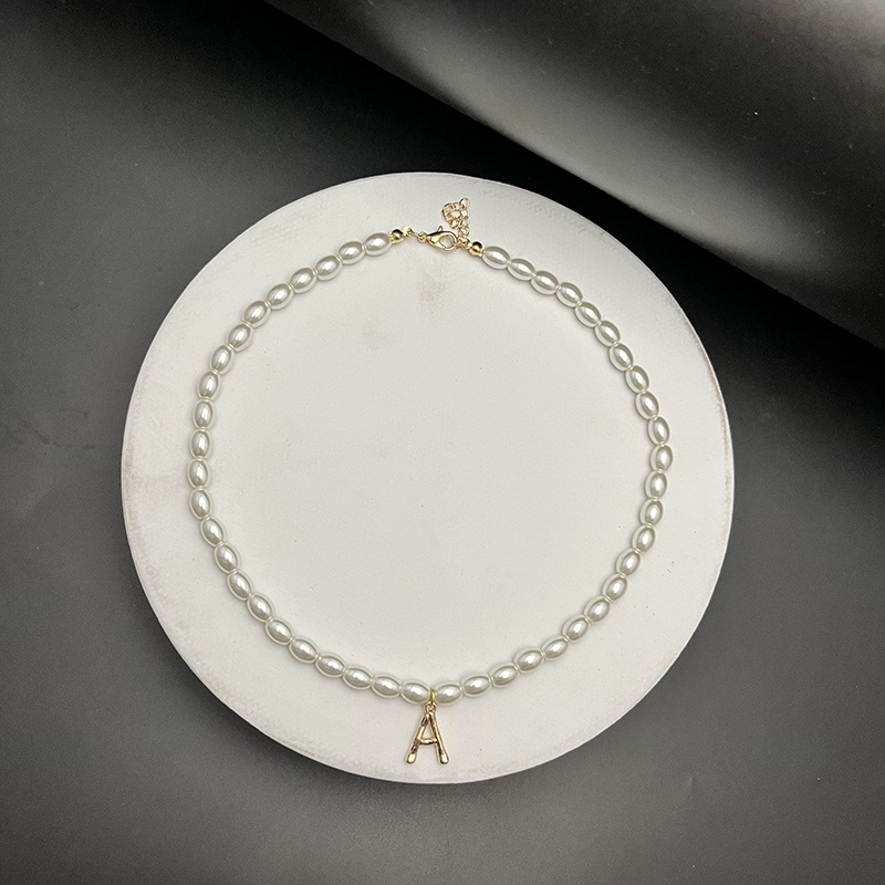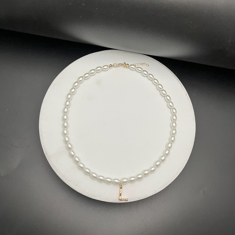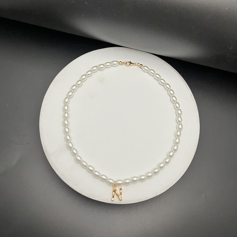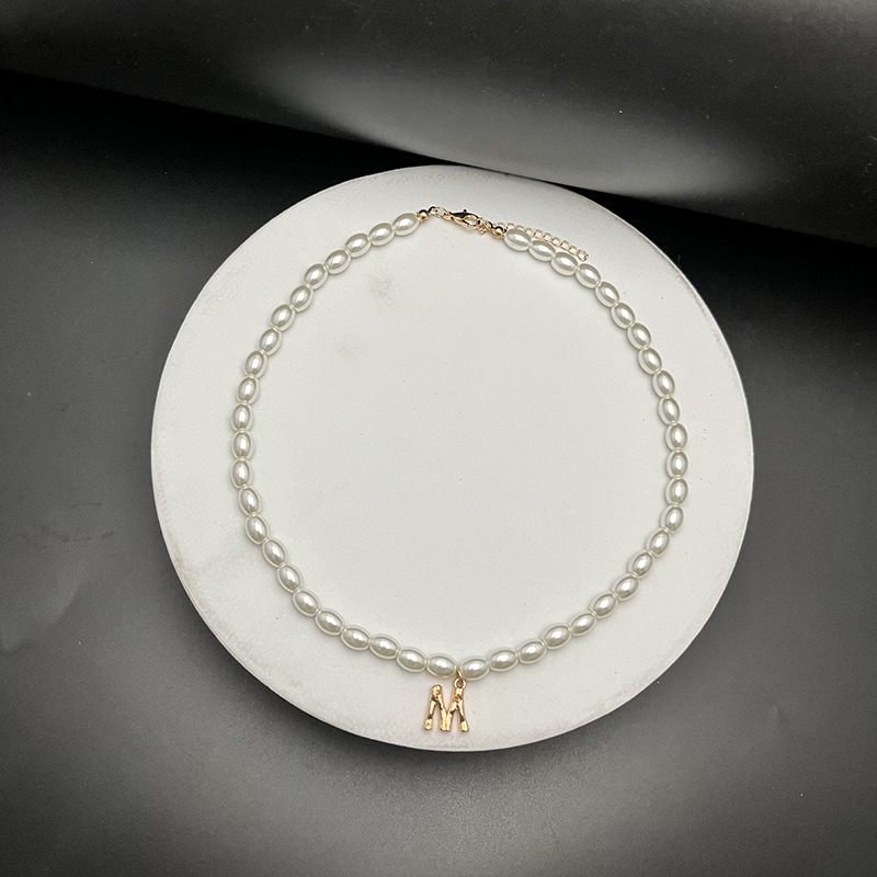 - Material: The necklaces appear to be made with white, oval-shaped pearls and golden letter pendants.