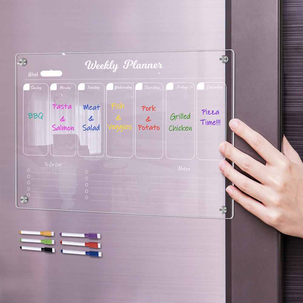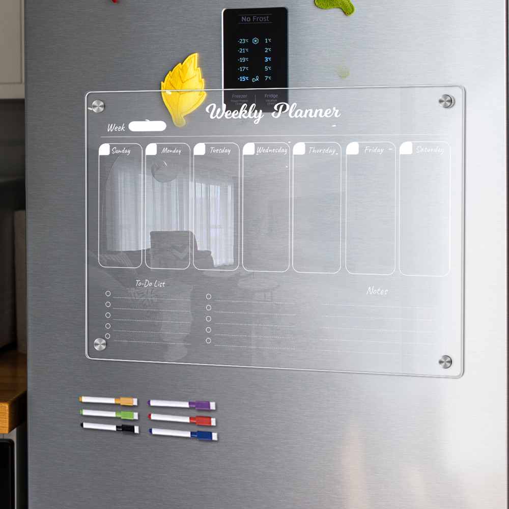 A transparent acrylic dry-erase board with magnetic backing for your fridge. Perfect for monthly planning, reminders, and office notes. Reusable and frameless for a sleek look.