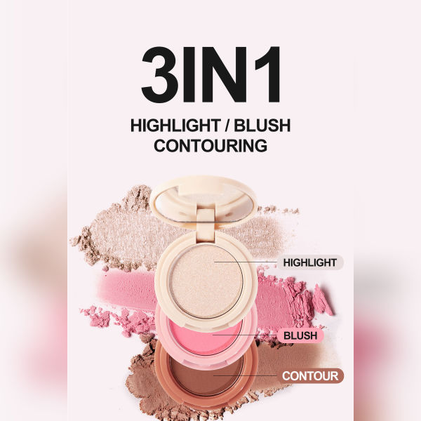 - Components: Contains a highlighter, blush, and contour powder in separate pans within a single compact.